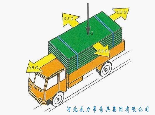 4.在垂直方向上,由于顛簸,所載貨物有一個向上或向下的作用力,此作用力為所載貨物重量的0.8倍。阻擋這些作用力,必須使所載貨物與承載面有足夠的摩擦力。而貨物如果沒有外界作用力,光靠貨物本身的重量所產(chǎn)生的摩擦力是遠遠不夠的。必須用捆綁工具,使貨物與承載面足夠的摩擦力,或拉住貨物。比如一個10噸的貨物,當摩擦系數(shù)為0.3時,僅可產(chǎn)生3噸的摩擦力。而當運輸工具急剎車時,此貨物有8噸的向前沖力。因此,另外5噸力必須通過捆綁工具來達到。